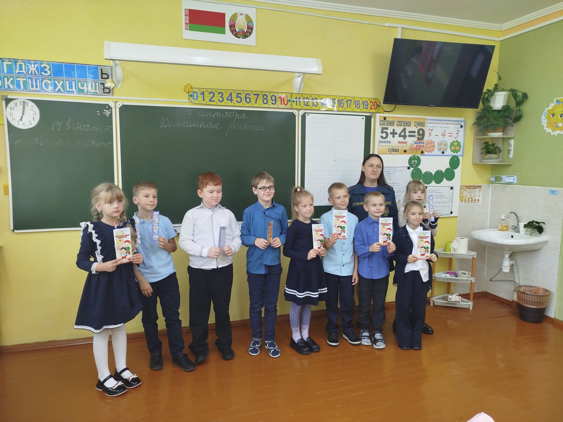 В завершение увлекательного урока безопасности гости из РОЧС приготовили для школьников приятный сюрприз. Каждый ребенок получил из рук спасателей небольшой, но очень полезный подарок — обучающие брошюры и памятки от МЧС Республики Беларусь, которые будут напоминать о важных правилах. Радости ребят не было предела!