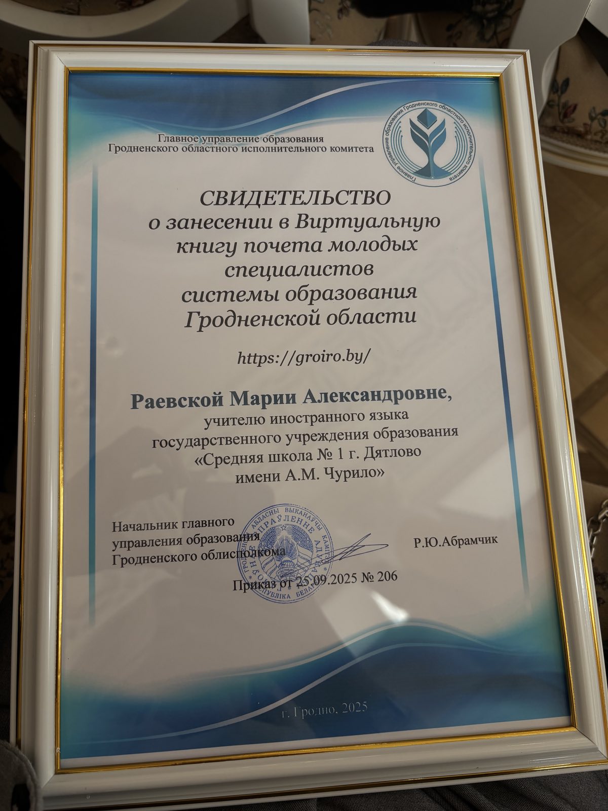С большим радостью и искренним уважением сообщаем, что Раевская Мария Александровна, учитель иностранного языка государственного учреждения образования «Средняя школа №1 г. Дятлово имени А.М. Чурило», занесена в Виртуальную книгу почёта молодых специалистов системы образования Гродненской области!
