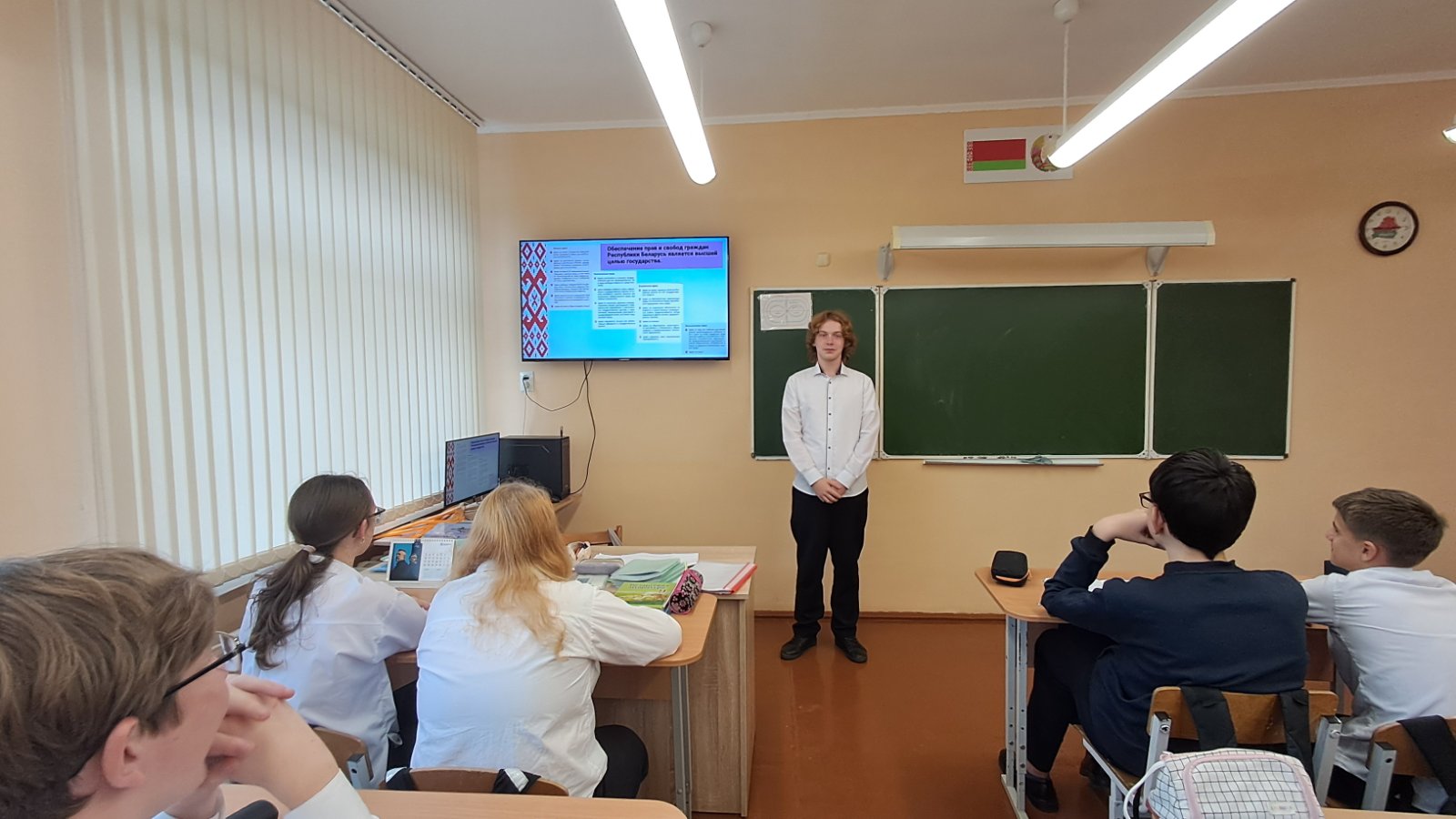 Занятие прошло в интерактивной и вовлекающей форме. Учащиеся начали с просмотра образовательного видеоролика «Конституция Республики Беларусь», который помог им вспомнить основные положения главного закона страны и понять, как он регулирует жизнь каждого гражданина.