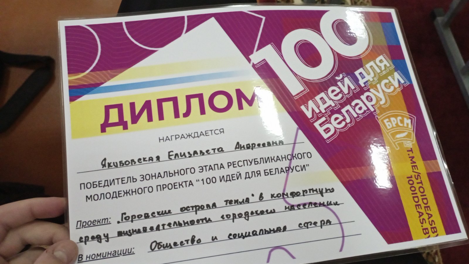 В номинации "Общество и социальная сфера" победителем признана Якубовская Елизавета, учащаяся 9 "А" класса средней школы №1 г. Дятлово им. А.М.Чурило.