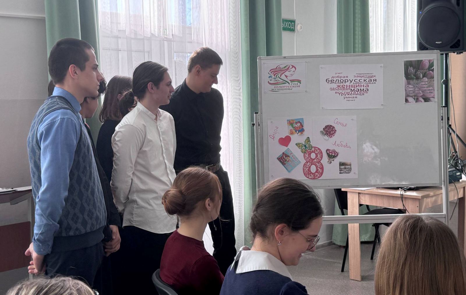 В свою очередь участвующие в мероприятии взрослые, классный руководитель и мамы учащихся, Ирина Анатольевна Бущик, Елена Павловна Макарчук, Татьяна Владимировна Оверкова, Оксана Геннадьевна Кармильчик поделились секретами собственного успеха. В завершении урока участники обсудили топ-7 ценностей белорусских женщин и нынешнего молодого поколения, а также какой проект в рамках Года белорусской женщины будет реализован классным коллективом. От юношей девочки и женщины получили поздравительную открытку, женщины - цветы!